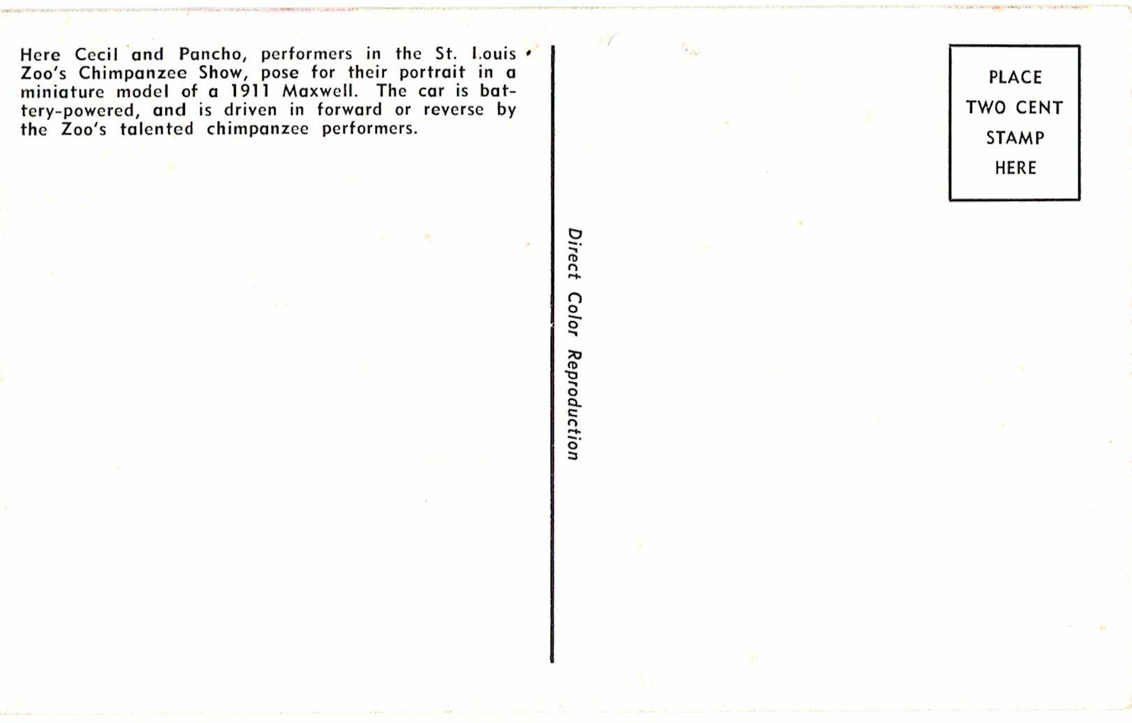 Chrome postcard. Chimpanzee Show, St Louis Zoo, Missouri. Cecil and Pancho driving 1911 Maxwell car, 1952.