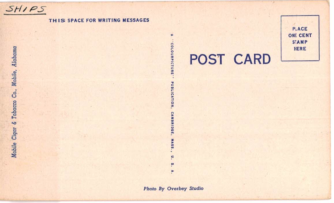 Publisher: Mobile Cigar & Tobacco Co, Mobile, AL. Colourpicture, Cambridge, MA.