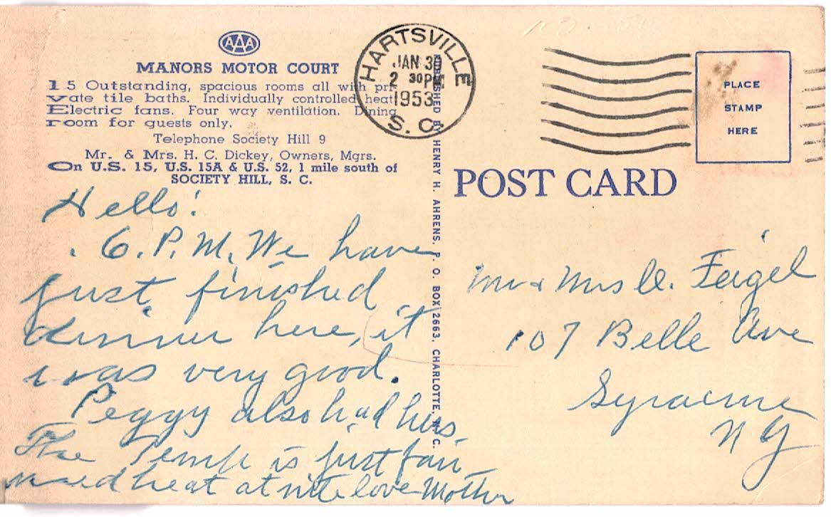 Linen postcard. Manors Motor Court, Society Hill South Carolina. Owners & Managers Mr & Mrs H C Dickey, 1953.