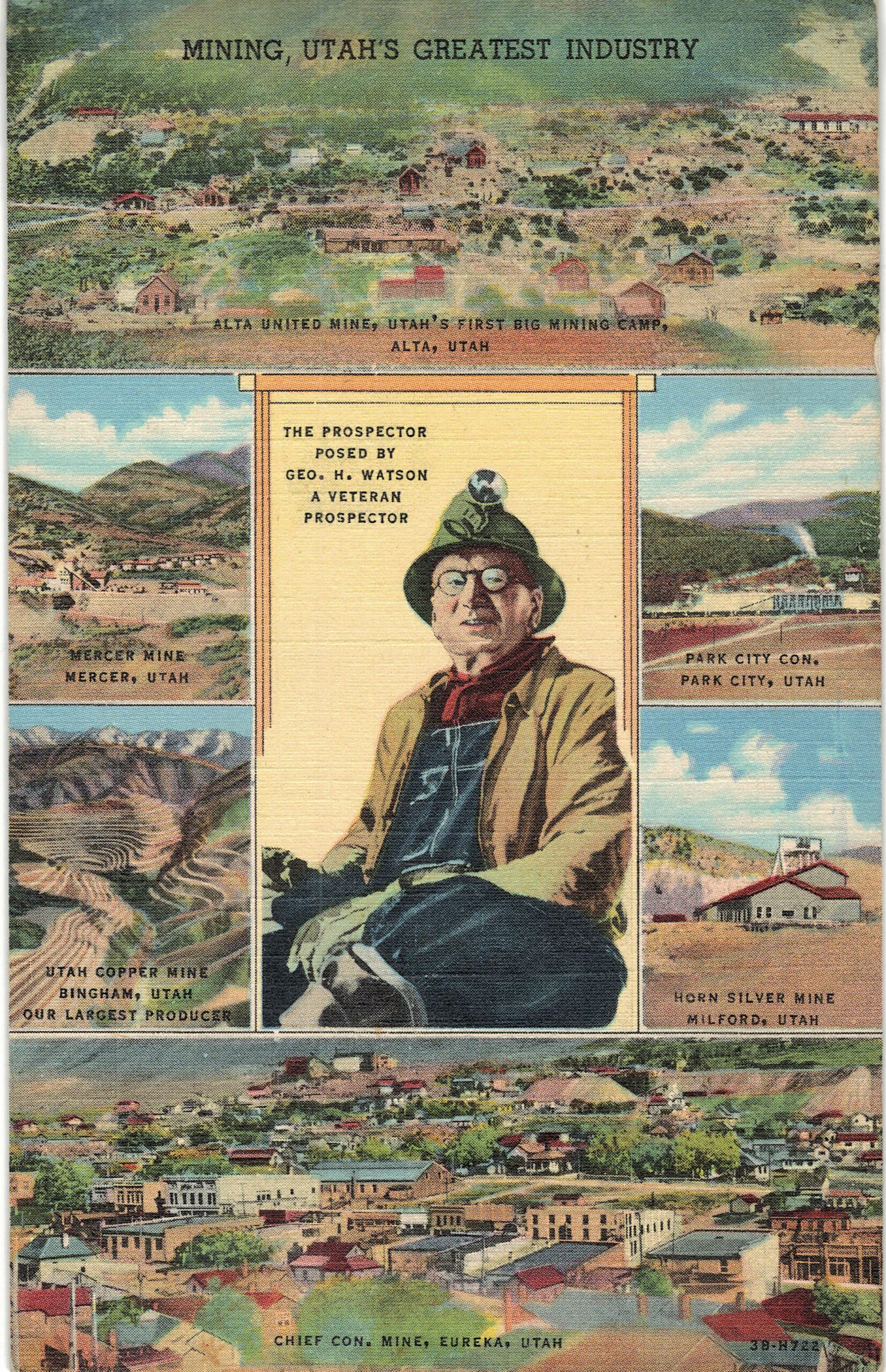 Linen postcard. Mining Utah. Alta United Mine, Mercer Mine, Copper Mine, Horn Silver Mine, Park City Con, Chief Con Mine. Prospector George Watson.