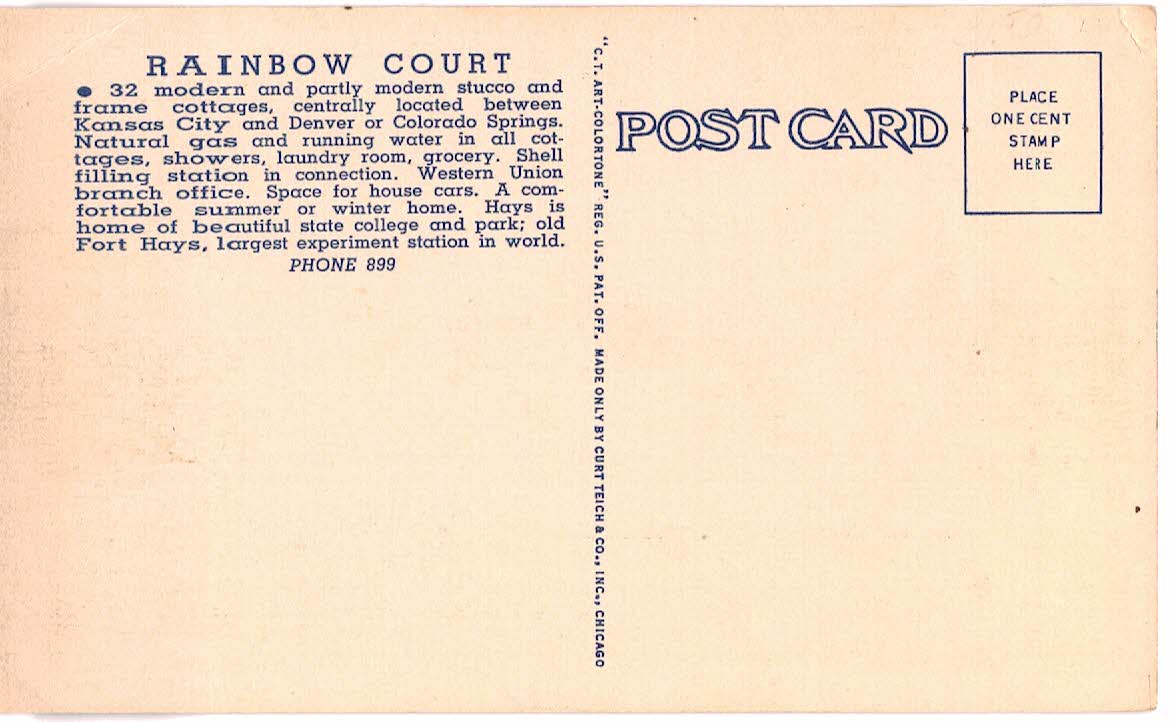 Linen postcard. Panorama of Rainbow Court, Hays, Kansas. East Entrance.