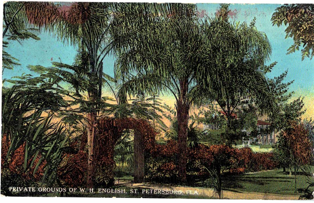Old postcard. Private Grounds of W H English, St Petersburg, Florida. Palm trees.