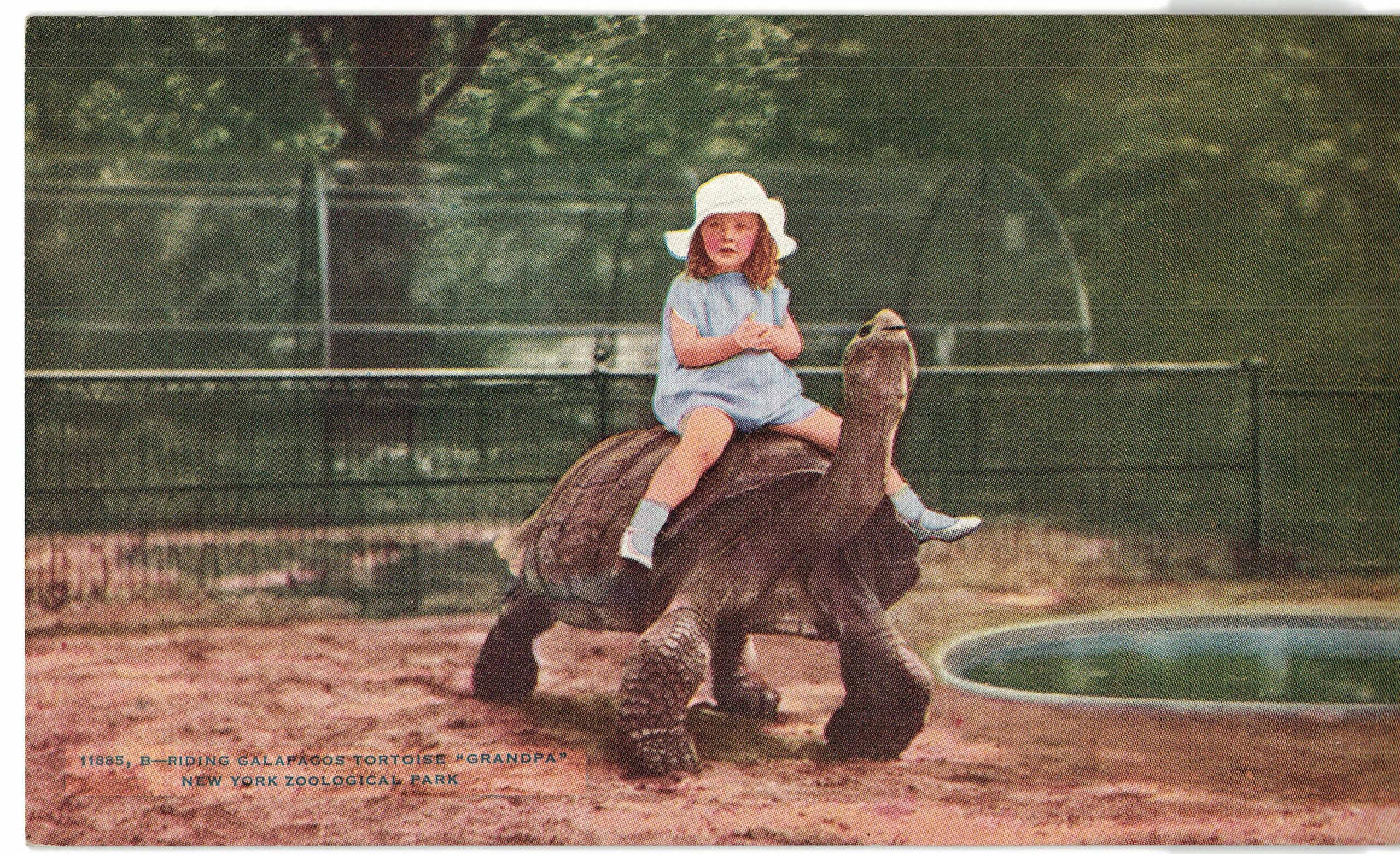 Postcard. Riding Galapagos Tortoise “Grandpa”, New York Zoological Park, Jamaica, New York. Zoo, girl.