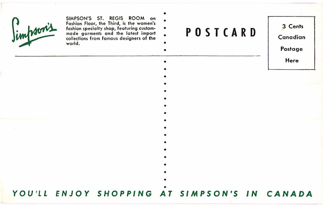 Postcard. Simpson’s St Regis Room, Fashion Floor, Canada.