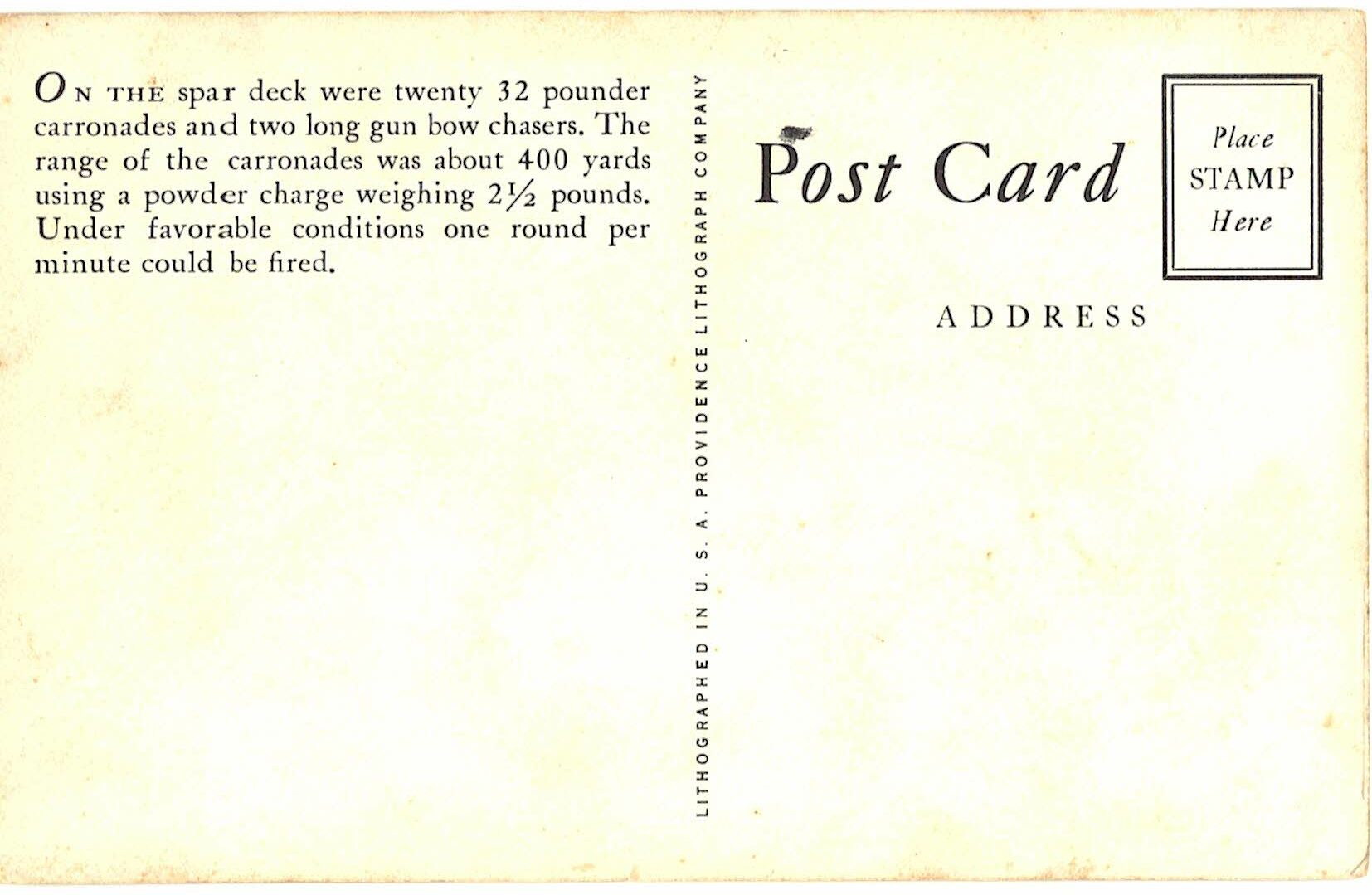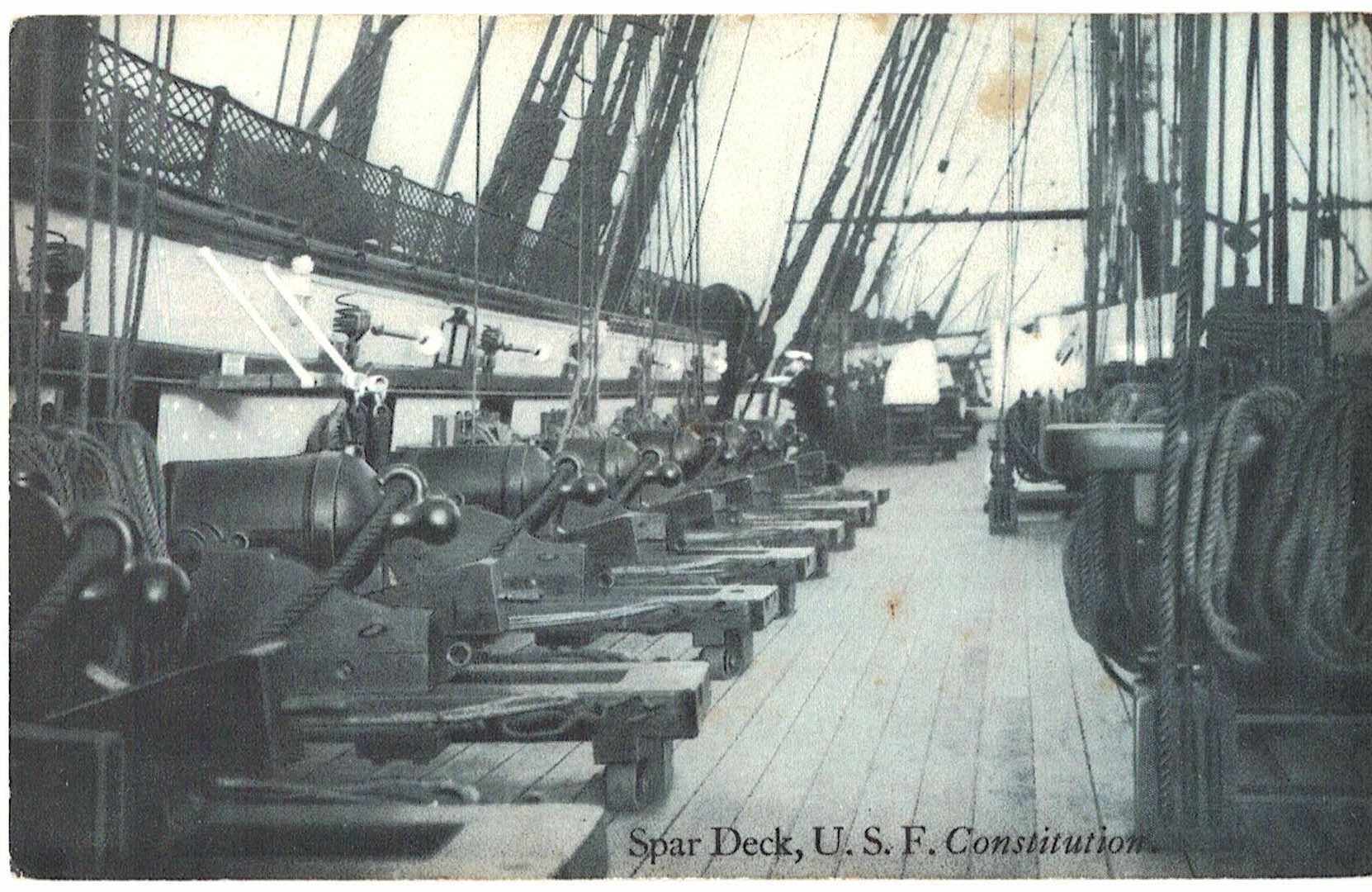 Postcard. Spar Deck, USF Constitution. Ship, long gun bow chasers, carronades.