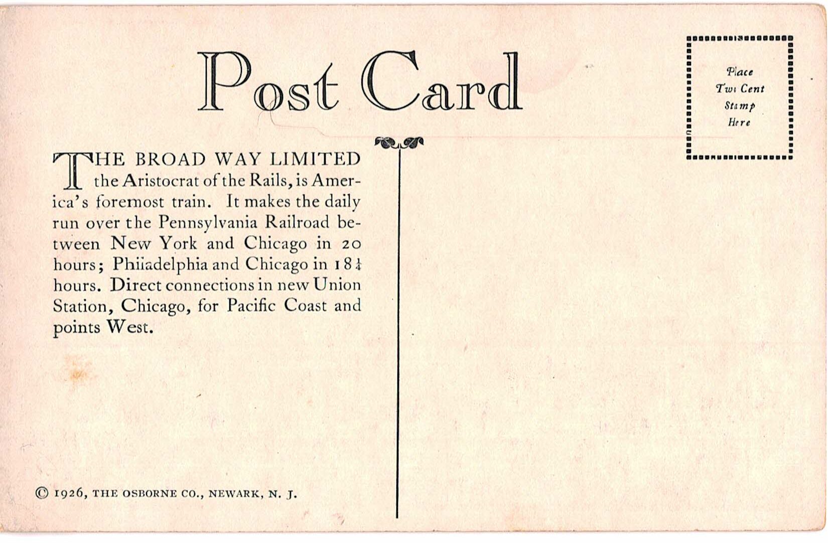 White border postcard. Broad Way Limited, Pennyslvania Railroad. 1926. Speed and security.
