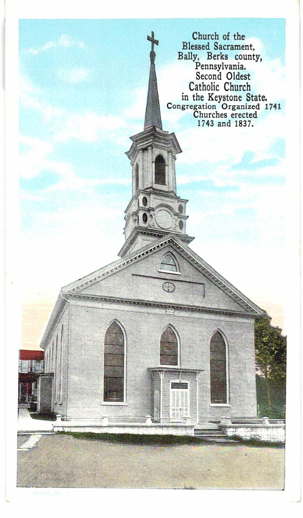 White border postcard. Church of the Blessed Sacrament, Bally, Berks County, Pennsylvania. Catholic.